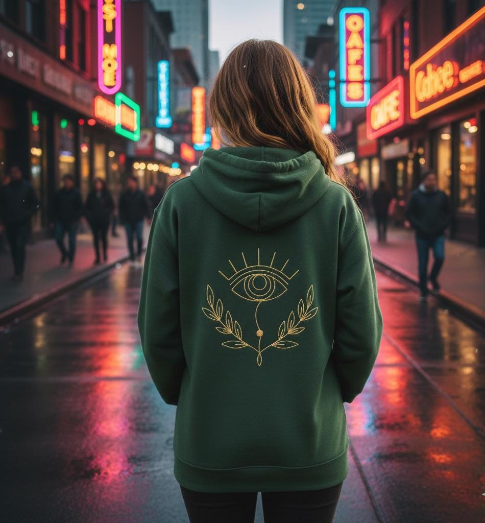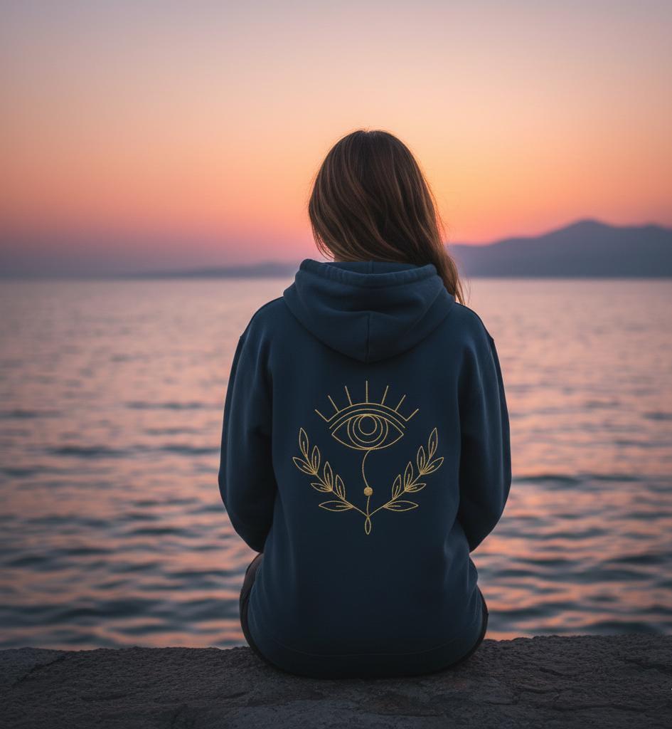 This digital embroidery file combines the theme of the "Eye," a powerful symbol of protection, with a minimalist Line Art aesthetic. The eye is surrounded by elegant olive or laurel branches. It adds a mystical, luxurious, and meaningful air to your projects, especially when embroidered with gold-toned thread.